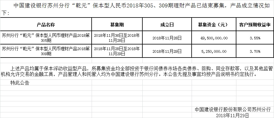 中国建设银行苏州分行“乾元”保本型人民币2018年305、309期理财产品成立公告